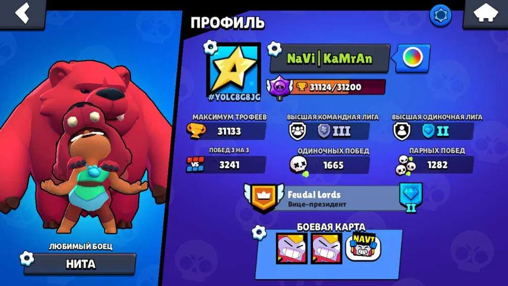 🏆Кубков: 10123; ⭐Уровень: 117; 💪Бойцов: 35/72; ⚡Леги: Спайк;